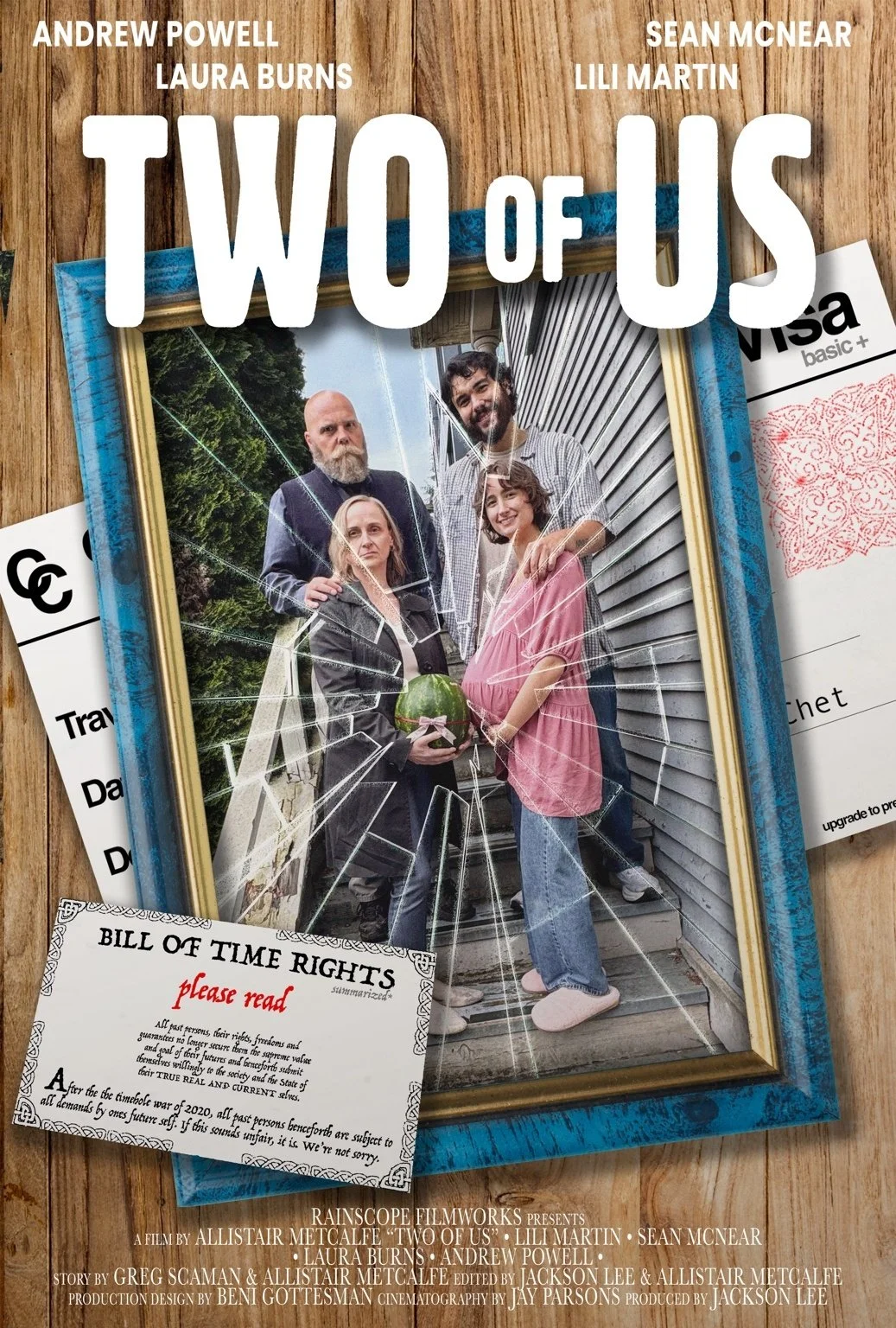 Movie poster for 'Two of Us,' featuring four people and a broken picture frame. The poster includes text with the names of the actors, and various documents such as a 'Bill of Time Rights' and some credit information at the bottom.